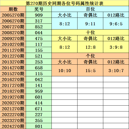 历史同期第270期十位号码开出为:0、1、5、4、7、1、5、2、5、5、1、4、4、5、0、1、7、2、5、0,振幅为7个点位,012路号码比例为3:9:8,大小 号码比例为8:12,奇偶号码比例为12:8,本期预计十位出现2路号码,独胆关注8。
