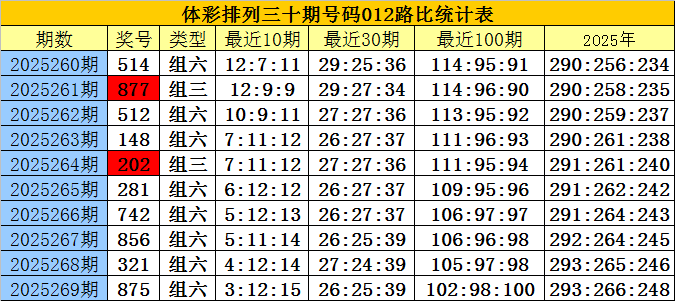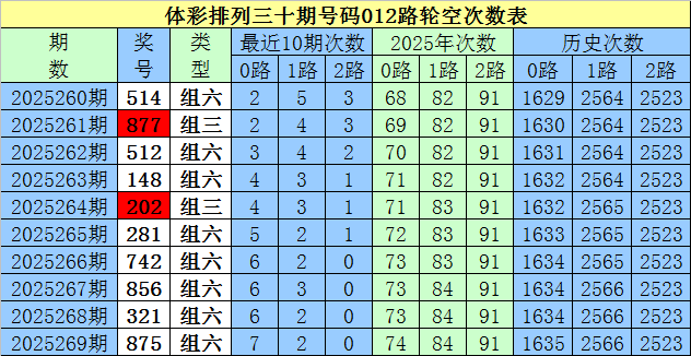 开奖回顾:排列三第2025269期奖号为:875,号码012路比为0:1:2。
