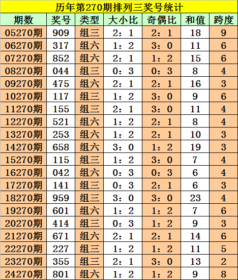 历年第270期奖号中:组三开出10次,组六开出10次。组六出现频次较低,本期重防组六。