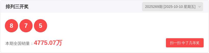 排列325269期开奖结果8 7 5,和值20,跨度3,质合比2:1,和值尾0。