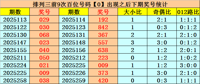 百位号码:百位上期奖号为1路、偶数、大号:0,历史上百位号码0共开出720期,前一次开出期数在第2025258期,上期奖号隔11期再次开出。
