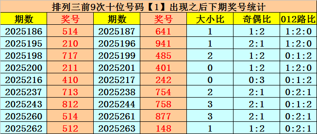 十位号码:十位上期开出偶数、大号、1路号码:1,历史上十位号码1共开出728期,上一次出现在第2025262期,上期奖号遗漏值为7期。