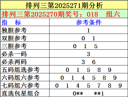 开奖回顾:排列三第2025270期开出奖号:018。其中奖号大小比为1:2,奇偶比为1:2,012路比为1:1:1,和值为9,跨度为8。