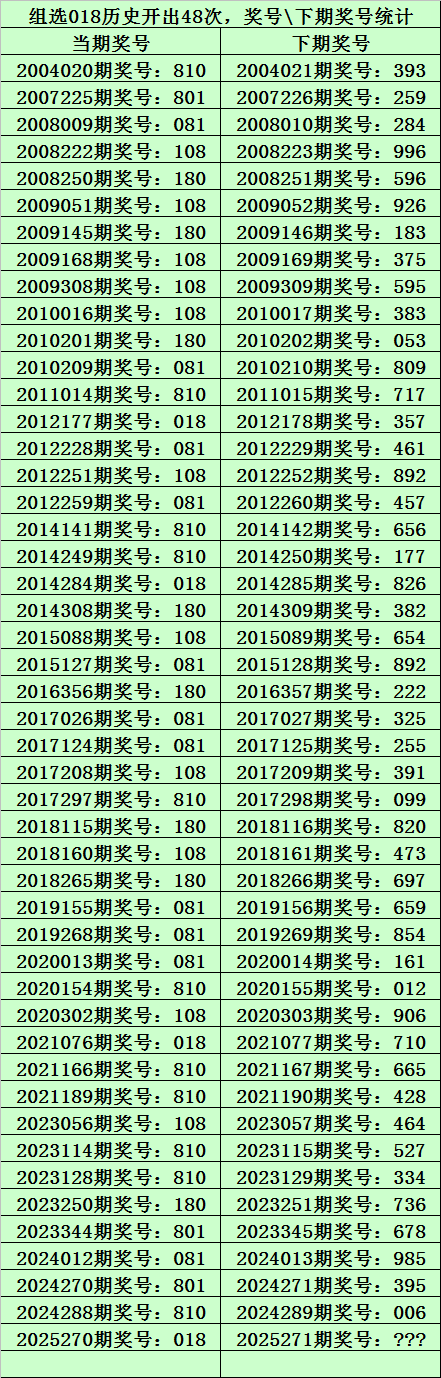 二、组选018分析:排列三历史上已开出48次组选号码018了,其奖号和下期开出奖号统计如下: