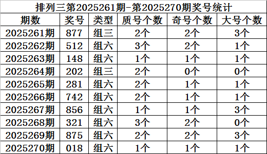 上期回顾:排列三第2025270期开奖:018,质合比为1:2,奇偶比为1:2,大小比为1:2。