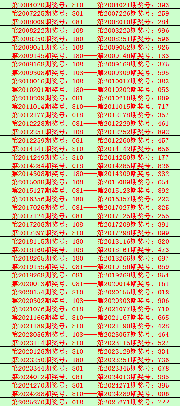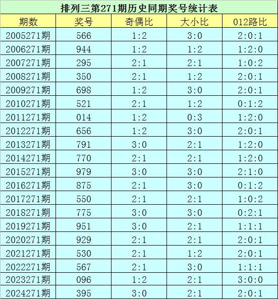 排列三第2025271期开奖日期:2025年10月12日,历史上第271期已开出了20次奖号,历年同期号码分别为:566、944、295、350、698、521、014、656、791、770、979、875、550、775、951、929、530、567、096、395。