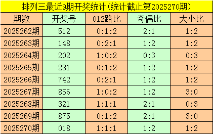 二、体彩排列三前9期奖号开出:512-148-202-281-742-856-321-875-018,其中奖号大小比为11:16,012路比为4:9:14,奇偶比为11:16;