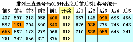 四、排列三直选号码018历史上开出4次,其前后五期奖号分别为: