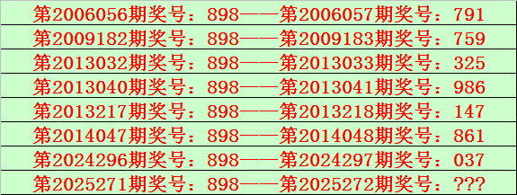 排列三第2025271期开出奖号898,该号码直选类型历史上出现了8次,前7次开出之后期下期奖号为:791、759、325、986、147、861、037,见下表: