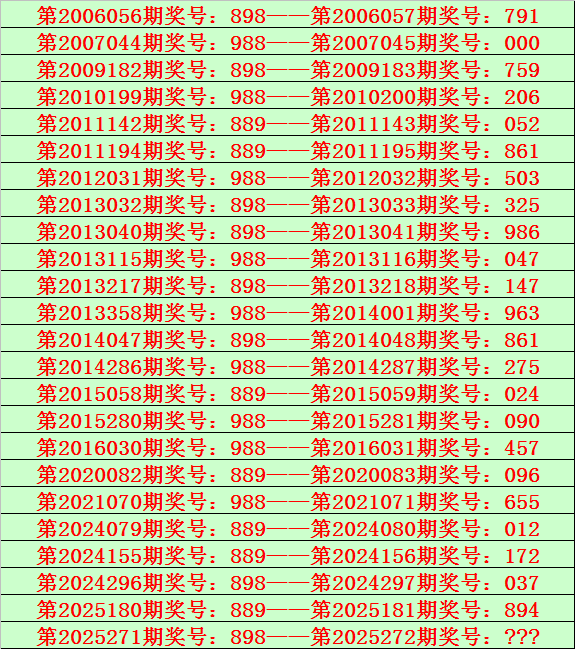 排列三第2025271期开出奖号898,该号码历史上组选出现24次,前23次开出之后期下期奖号为:791、000、759、206、052、861、503、325、986、047、147、963、861、275、024、090、457、096、655、012、172、037、894,详见下表: