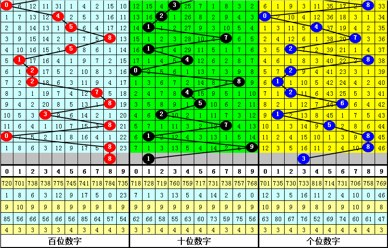 目前个位最冷号码为9,遗漏46期,历史上该号码最大遗漏为51期,本期预计个位号码9继续走冷。