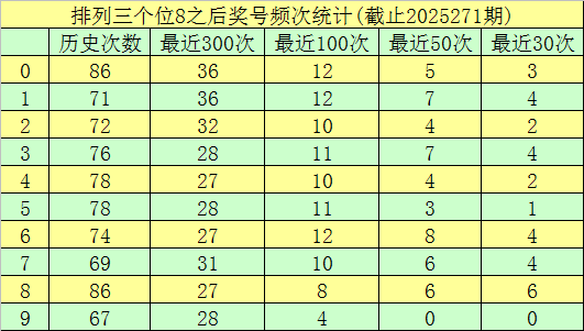 第三位开奖8在最近三次之后,下期落号分别为:0-2-8,奖号出现在:热号区段、冷号区段、冷号区段,本期第三位关注冷号区段奖号,注意热码区段号码逐渐转冷本期轮空。