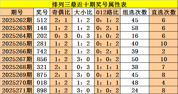 上期回顾:体彩排列三第2025271期奖号:898,奇偶比1:2,大小比3:0,012比1:0:2。