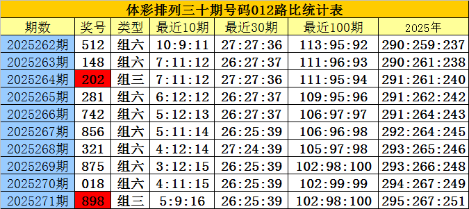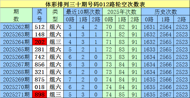 开奖回顾:排列三第2025271期奖号为:898,号码012路比为1:0:2。