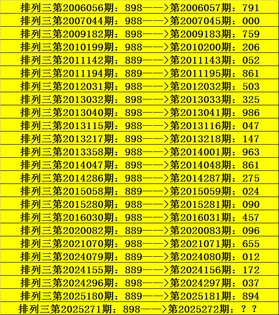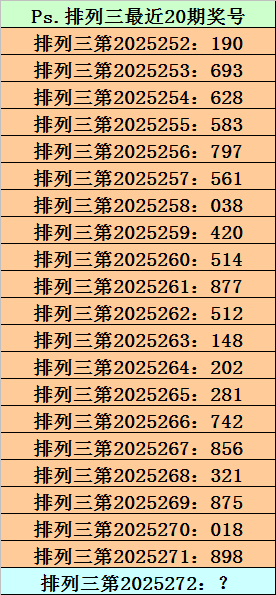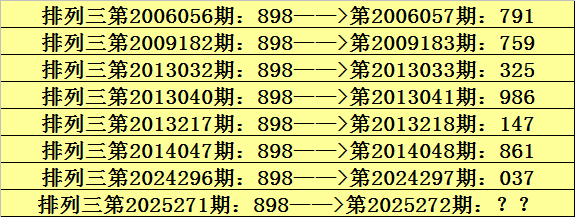 第2025271期排列三奖号为898,历史上该号码直选出现8次,下期奖号分别为:791、759、325、986、147、861、037。