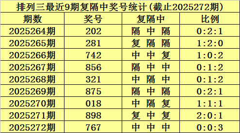 上期回顾:排列三第2025272期奖号为:767。大小比为3:0,奇偶比为2:1,012路比为1:2:0。