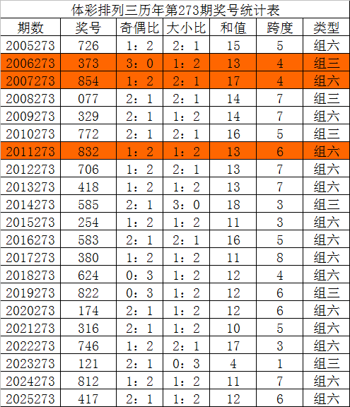 排列三第2025273期奖号为417,奇偶比为2:1,大小比为1:2,和值为12,跨度为6。