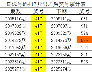 从上表统计可以看出,直选号码417开出之后,其下期奖号: