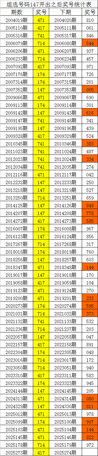 体彩排列三组选号码147历史上出现了57次,其下期奖号分别为:810、061、846、544、937、457、971、726、201、005、690、301、616、341、439、524、383、487、334、274、042、250、527、659、848、778、585、967、856、317、760、603、144、170、104、270、232、595、373、532、203、047、891、048、172、940、583、945、205、080、811、978、997、144、822、972,详细统计见下表: