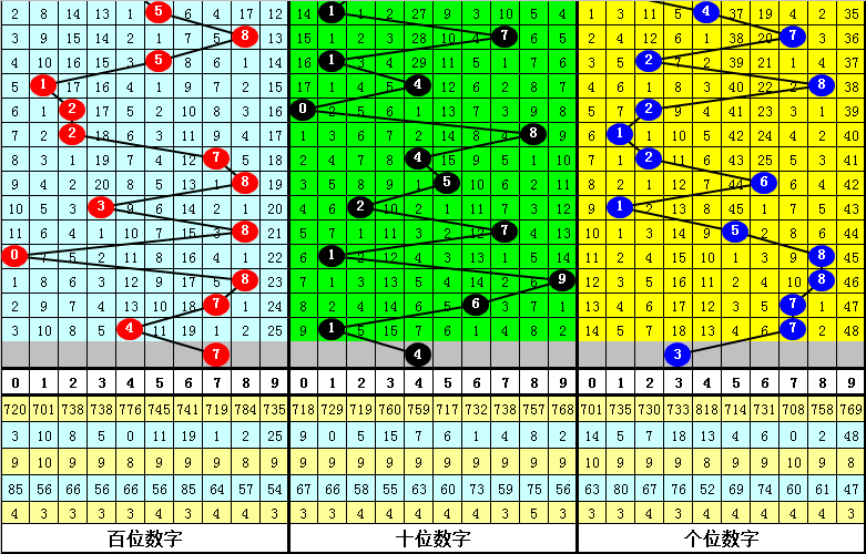 百位号码奇偶比为5:2,奇数号码表现相对较热,本期预计奇数号码再出;大小比为5:2,大号走势较热,本期防止大号再次出现。