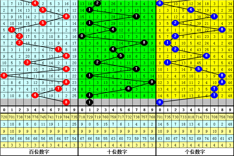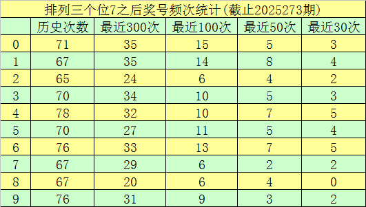 第三位杀号:第三位上期出现奖号7,该位历史上奖号7已开出了708次,最近100次第三位开出7时,下期号码0-9分别落号:号码0→15次,1→14次,6→13次,5→11次,3、4→10次,9→9次,2、7、8→6次。