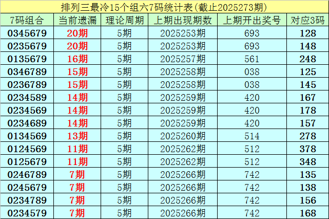 (2)在排列三第2025273期奖号中,最冷的7码组六遗漏20期,在这20期奖号中,组六号码开出15期,出现概率为75%,半顺组合开出8期,含1期全顺组合,开出概率为40%;杂六组合开出7期,开出概率为35%。