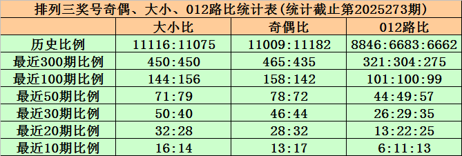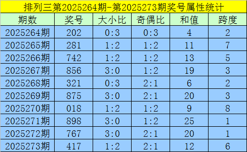 上期回顾:排列三第2025273期出现奖号417。开出组六,奇偶比2:1,012路比0:3:0,大小比1:2,和值12,跨度6。