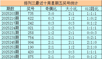 排列三十周星期五分别开出奖号:875、420、190、994、754、258、021、242、622、735,其中号码奇偶比为13:17,奇偶号码基本持平;号码大小比为13:17,大小 号码基本持平;号码012路比为8:9:13,2路号码走热。