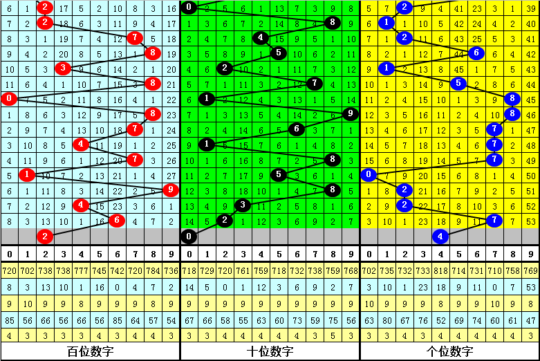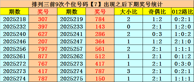 个位前9次开出号码7时,该位下期奖号分别为:4-3-6-4-1-2-7-7-0,其中号码个数大小比是3:6,012路比是3:5:1,奇偶比是4:5。