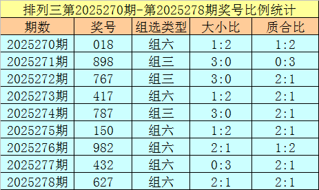 上期回顾:排列三第2025278奖号开出627,奖号质合比为2:1,大小比为2:1,跨度为5,类型为组六。