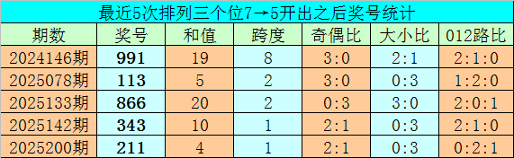 1、排列三前两期个位分别开出号码7和5,历史上个位号码连续两期分别出现7和5时,共有71次。在最近5次出现时,其下期分别出现号码:991、113、866、343、211;