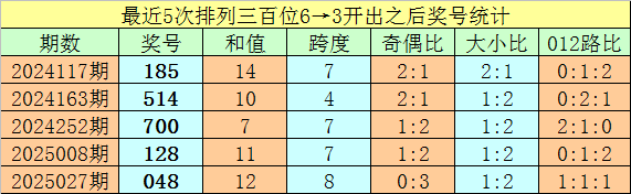 1、排列三最近两期百位号码分别开出6和3,历史上百位号码连续两期分别开出6和3的奖号出现了80期。前五期开出之后其下期奖号分别为:185、514、700、128、048;