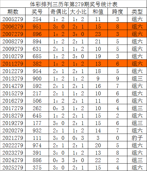 在历年排列三第280期开奖中:组三号码出现9次,组六号码出现11次。组三、组六号码出现比例持平,本期奖号形态关注:组六号码。