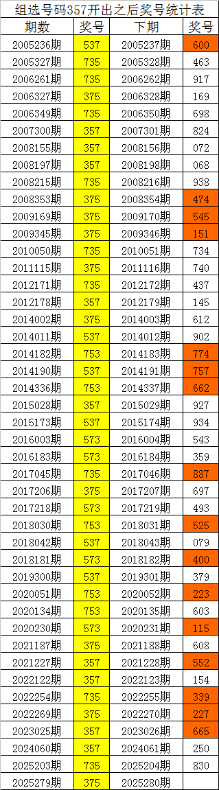 体彩排列三组选号码357历史上出现了44次,其下期奖号分别为:600、463、917、169、698、824、072、068、938、474、545、151、734、740、437、145、612、902、774、757、662、927、934、543、359、887、697、493、525、079、400、379、223、603、115、608、552、154、339、227、665、250、830,详细统计见下表: