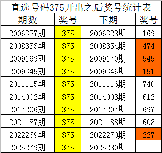 从上表统计可以看出,直选号码375开出之后,其下期奖号: