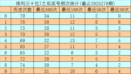 第二位杀号:第二位上期开出奖号为7,该位历史上奖号7开出了739次,最近100次第二位奖号出现7后,下期落号0-9次数从高到低分别为:号码4→13次,1、3→12次,0、2、5→11次,9→10次,7、8→7次,6→6次。