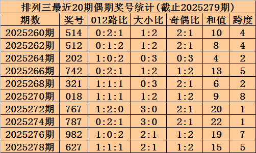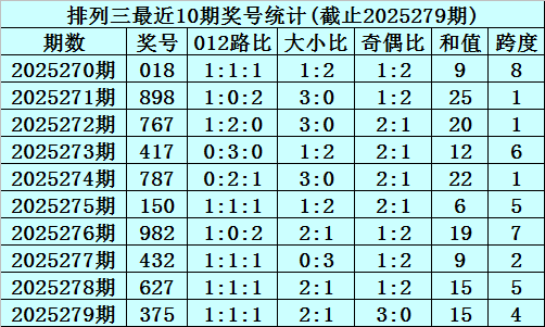 上期回顾:排列三2025279期奖号为375,奇偶比为3:0,大小比为2:1,跨度为15。