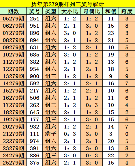 排列三第2025279期奖号:375,和值15,跨度4,大小比2:1,奇偶比3:0。