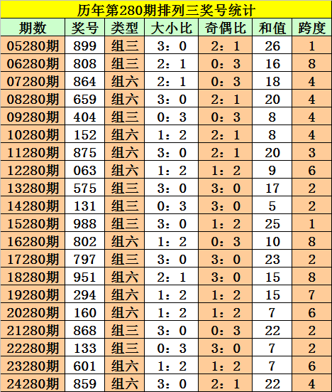 历年第280期奖号中:组三开出9次,组六开出11次。组六出现频次较低,本期重防组六。