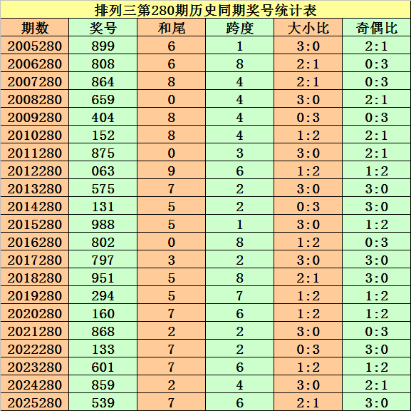 历年第280期排列三同期奖号开出:899、808、864、659、404、152、875、063、575、131、988、802、797、951、294、160、868、133、601、859、539。