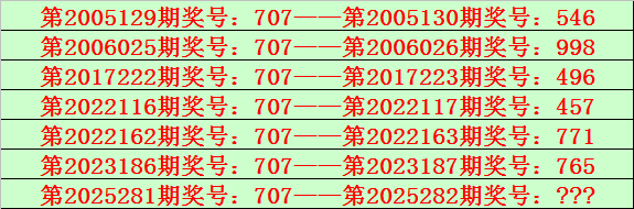 排列三第2025281期开出奖号707,该号码直选类型历史上出现了7次,前6次开出之后期下期奖号为:546、998、496、457、771、765,见下表: