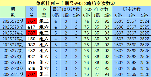 开奖回顾:排列三第2025281期奖号为:707,号码012路比为1:2:0。