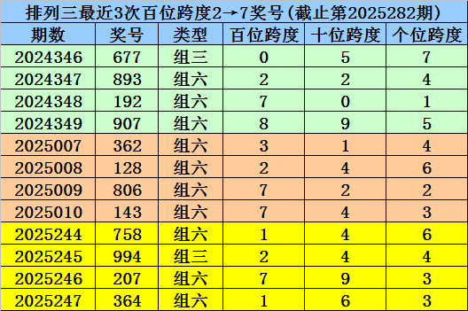 第2025244-第2025246期奖号:758、994、207,其下期奖号为:364,首位号码跨度为1;