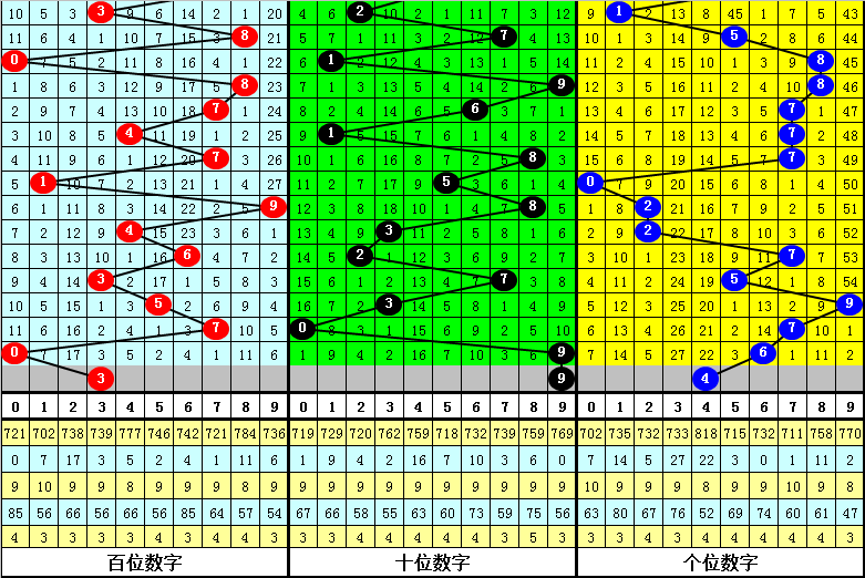 首位跨度分析:首位号码最近3期奖号为5-7-0,连续两期跨度为2、7,历史上首位号码连续两期分别开出跨度2、7的现象共出现55次,其前两次开出奖号分别为: