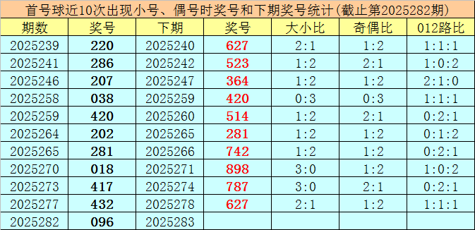 首号球:上期奖号为0,开出小 号、偶号,该位前10次开出小 号、偶号的现象时其奖号分别为:220、286、207、038、420、202、281、018、417、432,其中首号球012路比为2:3:5。