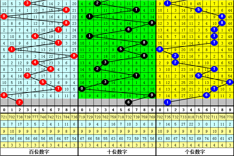大中小分析:在组选0-9号码分布图中,前10期小 号(0-2区段)出现8枚奖号,中号(3-6区段)出现10枚奖号,大号(7-9区段)出现12枚奖号,上期大中小区间分别出现1枚奖号,本期防大号转冷,预计7-9区段无号。