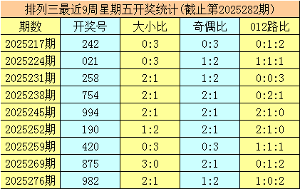 三、体彩排列三前9周星期五奖号分别开出:242-021-258-754-994-190-420-875-982,其中号码012路比为7:8:12,奇偶比为11:16,大小比为12:15;