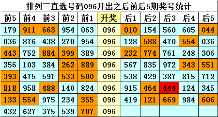 四、排列三直选号码096历史上开出8次,其前后五期奖号分别为:
