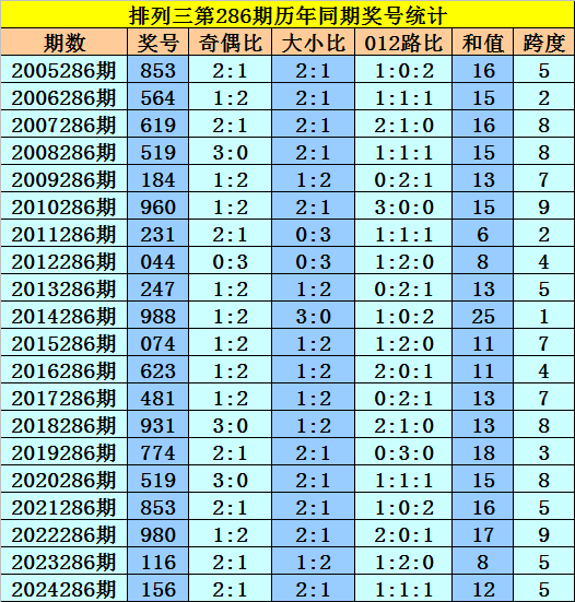 开奖回顾:排列三第2025285期开出奖号905,奖号012路比为2:0:1,大小比为2:1,奇偶比为2:1,最近三年第286期同期开出奖号为:第2022286期:980、第2023286期:116、第2024286期:156。