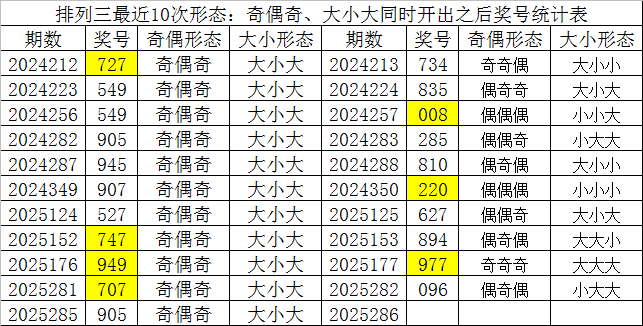 排列三最近10次同时开出奇偶形态:奇偶奇和大小形态:大小大时其奖号分别为:727-549-549-905-945-907-527-747-949-707-905,下期分别开出号码为:734-835-008-285-810-220-627-894-977-096,详细统计见下表: